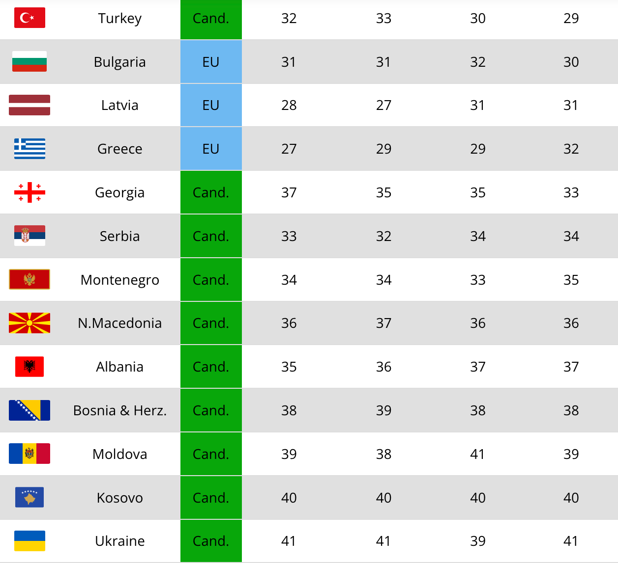 Ultimele nouă poziții sunt dominate de țările candidate la UE, Ucraina, Kosovo și Moldova încheind clasamentul. Turcia este excepția grupului, fiind proiectată pe locul 29 în 2030 — deasupra a trei membri cu drepturi depline ai UE: Bulgaria, Letonia și Grecia.