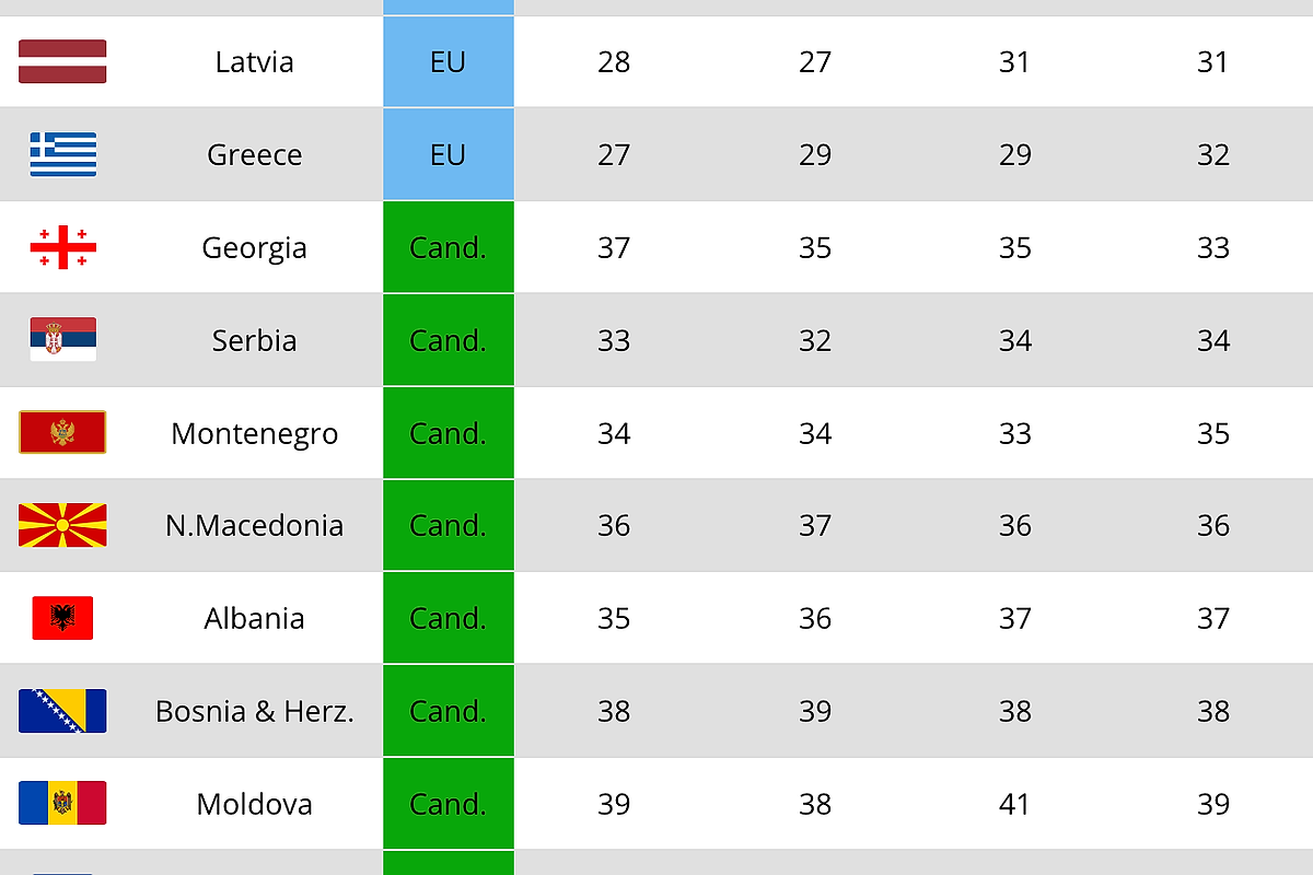 Modelul general se menține: țările din Europa de Nord și de Vest sunt grupate la vârf, în timp ce Europa de Est — și în special țările candidate la UE — rămân mult în urmă.