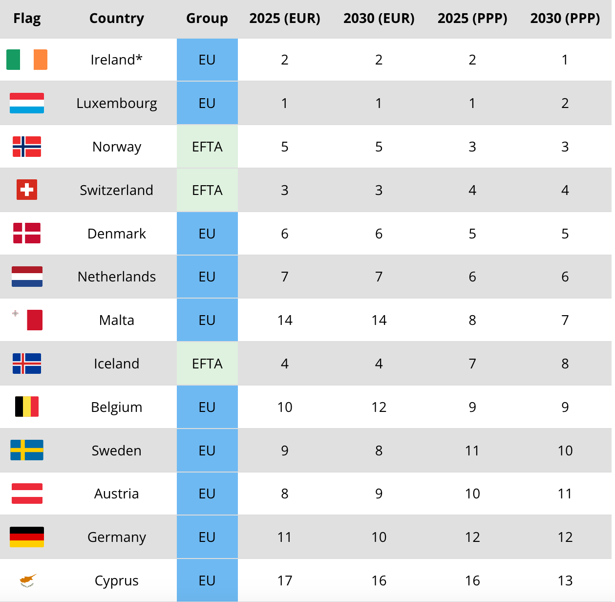 Dintre cele 41 de țări europene — inclusiv membre UE, țări candidate, membre EFTA și Regatul Unit — se preconizează că Irlanda va ocupa primul loc în tabelul PIB-ului pe cap de locuitor (PPP) până în 2030, detronând Luxemburgul, care conduce în 2025.