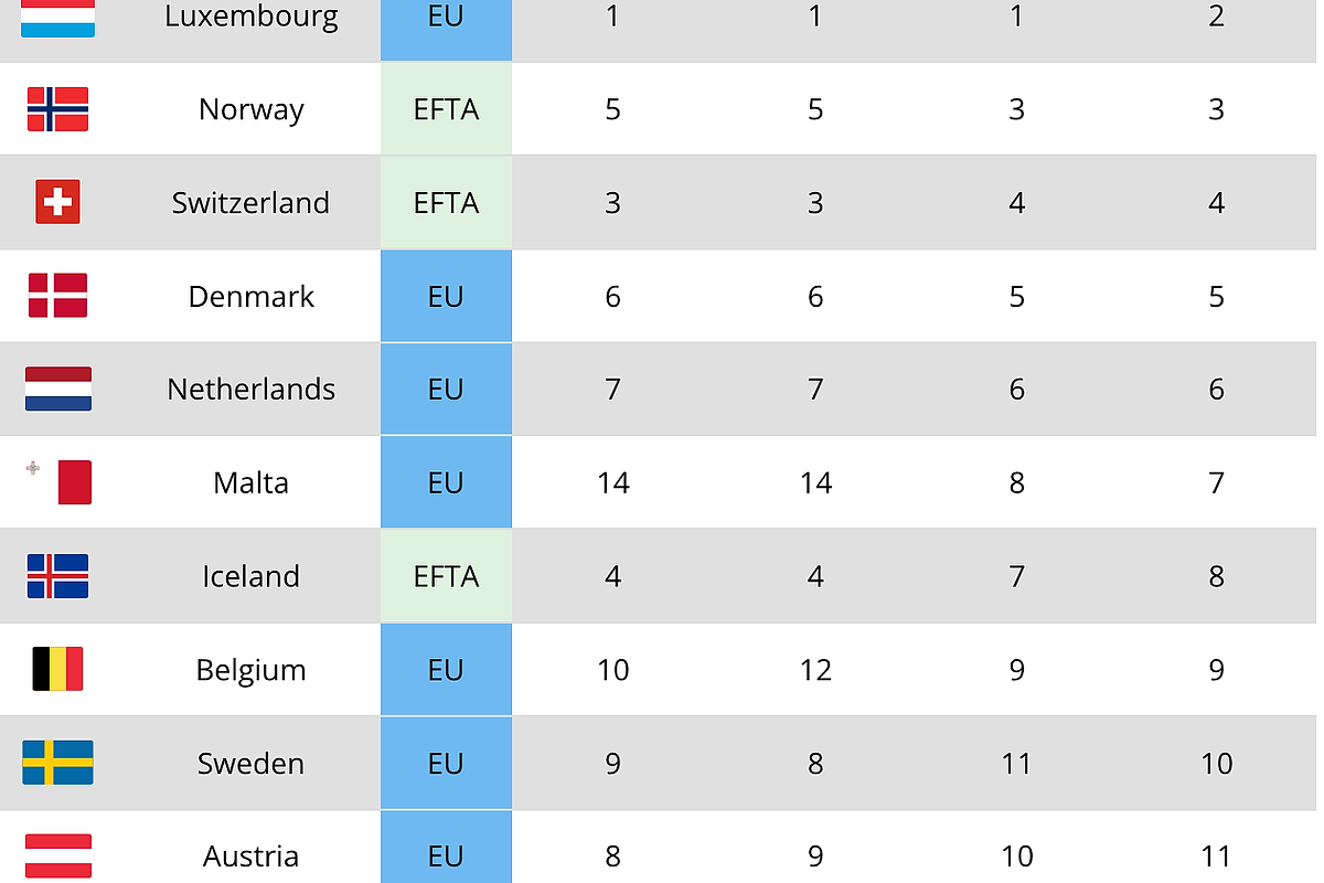 În afara UE, Elveția (127.846 €), Islanda (108.366 €) și Norvegia (93.046 €) se clasează în primele cinci locuri la nivel general, situându-se între Luxemburg și Irlanda la vârful ierarhiei.