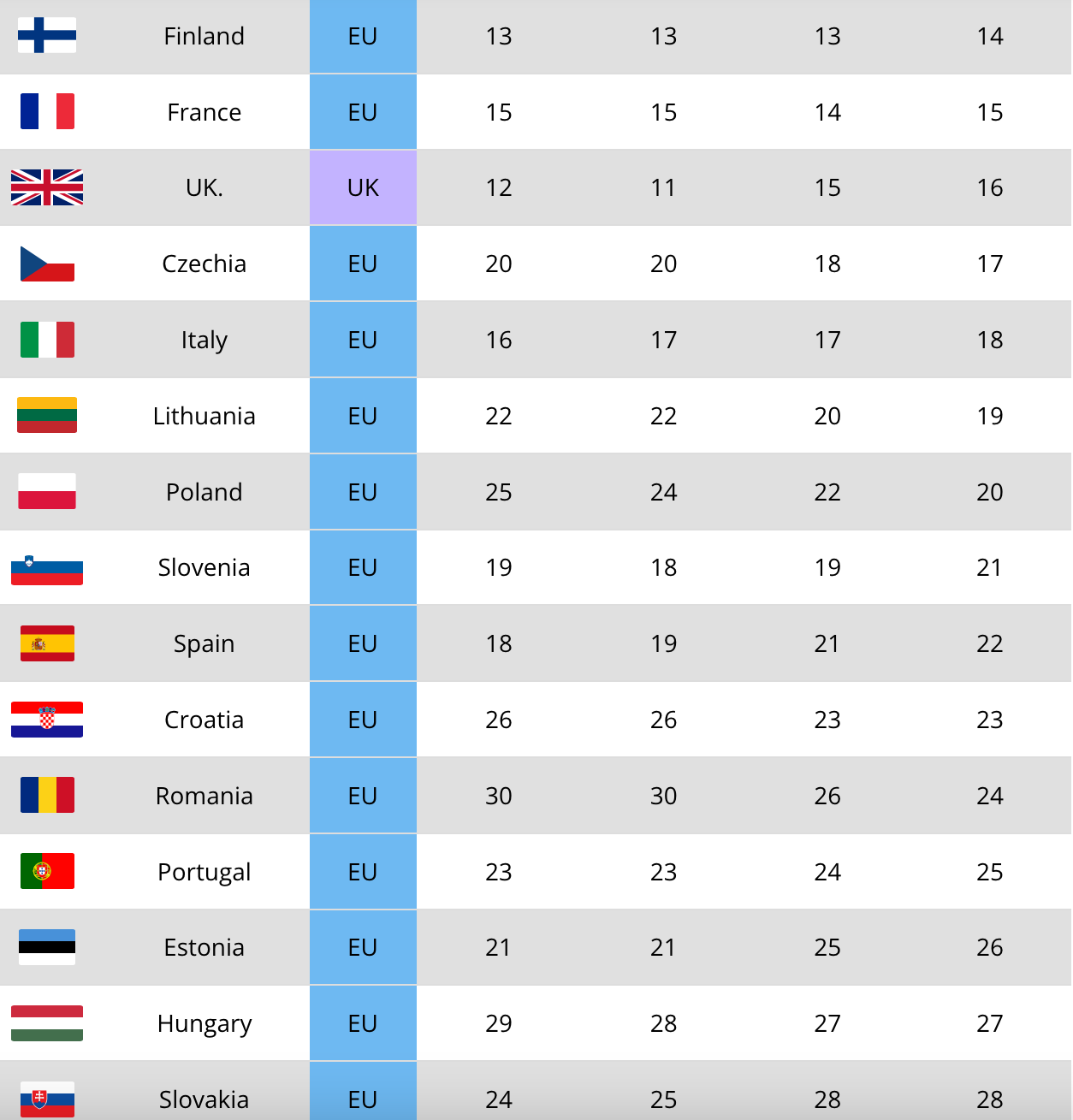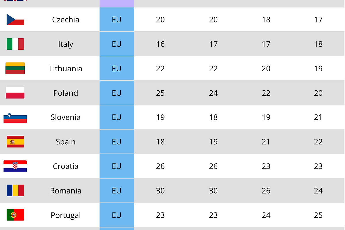 Cincisprezece țări sunt așteptate să își păstreze pozițiile între 2025 și 2030. Grecia înregistrează cea mai abruptă scădere, coborând de pe locul 29 pe 32, în timp ce Cipru marchează cel mai mare avans, urcând de pe 16 pe 13. Nicio altă țară nu este proiectată să se deplaseze cu mai mult de trei locuri.