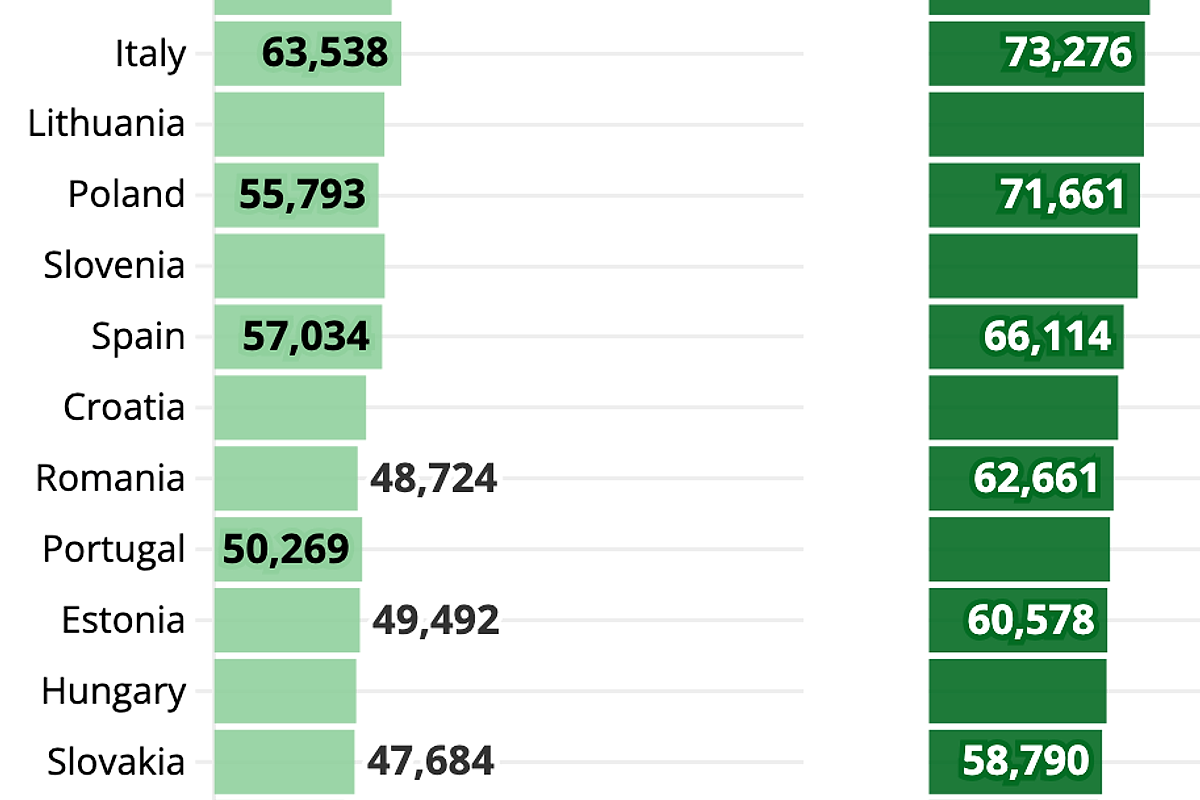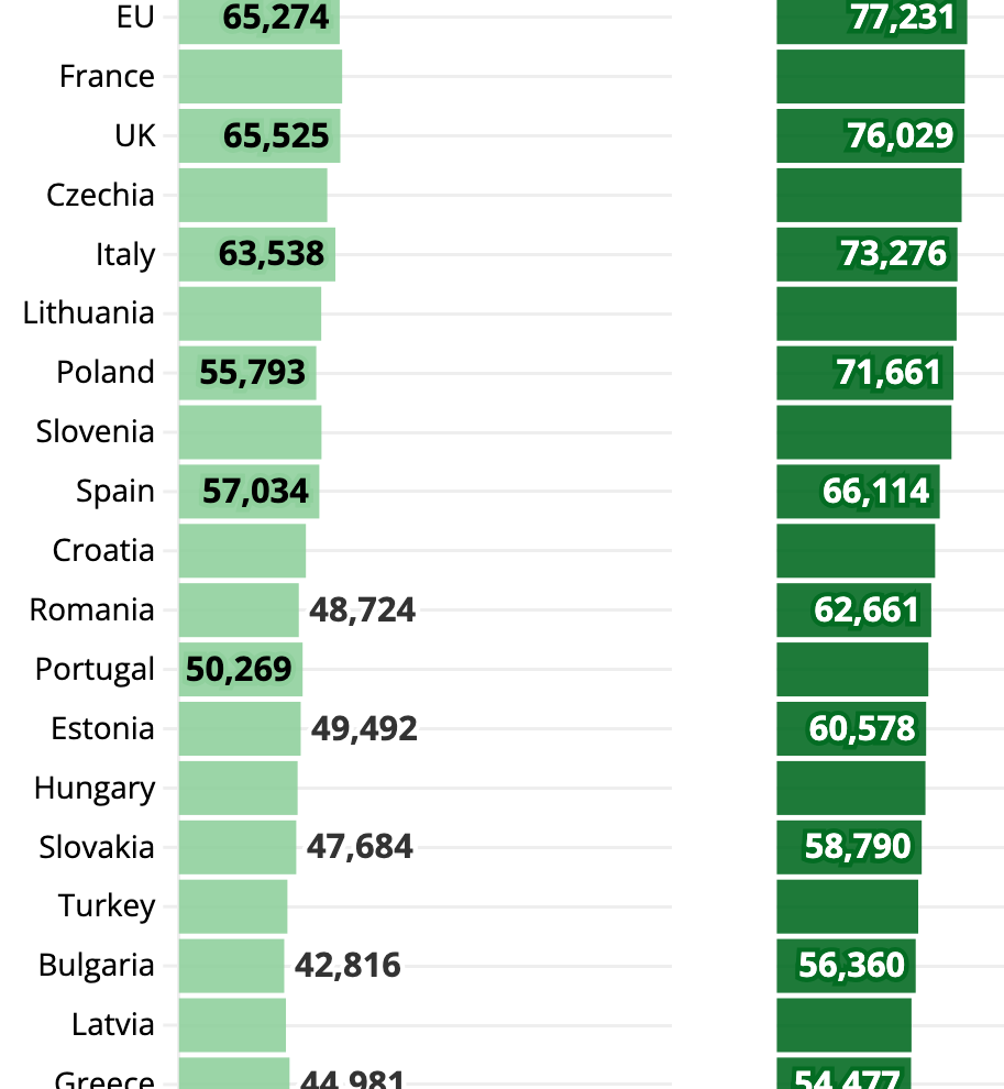 Chiar dacă lăsăm deoparte Luxemburg și Irlanda (137.819 €), variația în cadrul blocului comunitar este considerabilă. Danemarca se află pe locul trei în UE cu 84.128 €, urmată de Țările de Jos (79.613 €), Suedia (73.104 €) și Austria (67.406 €). Germania, cu 65.924 €, ocupă locul 10 la nivel general — fiind singura dintre cele mai mari cinci economii europene care intră în top zece. Regatul Unit urmează îndeaproape pe locul 11, cu 64.360 €.
